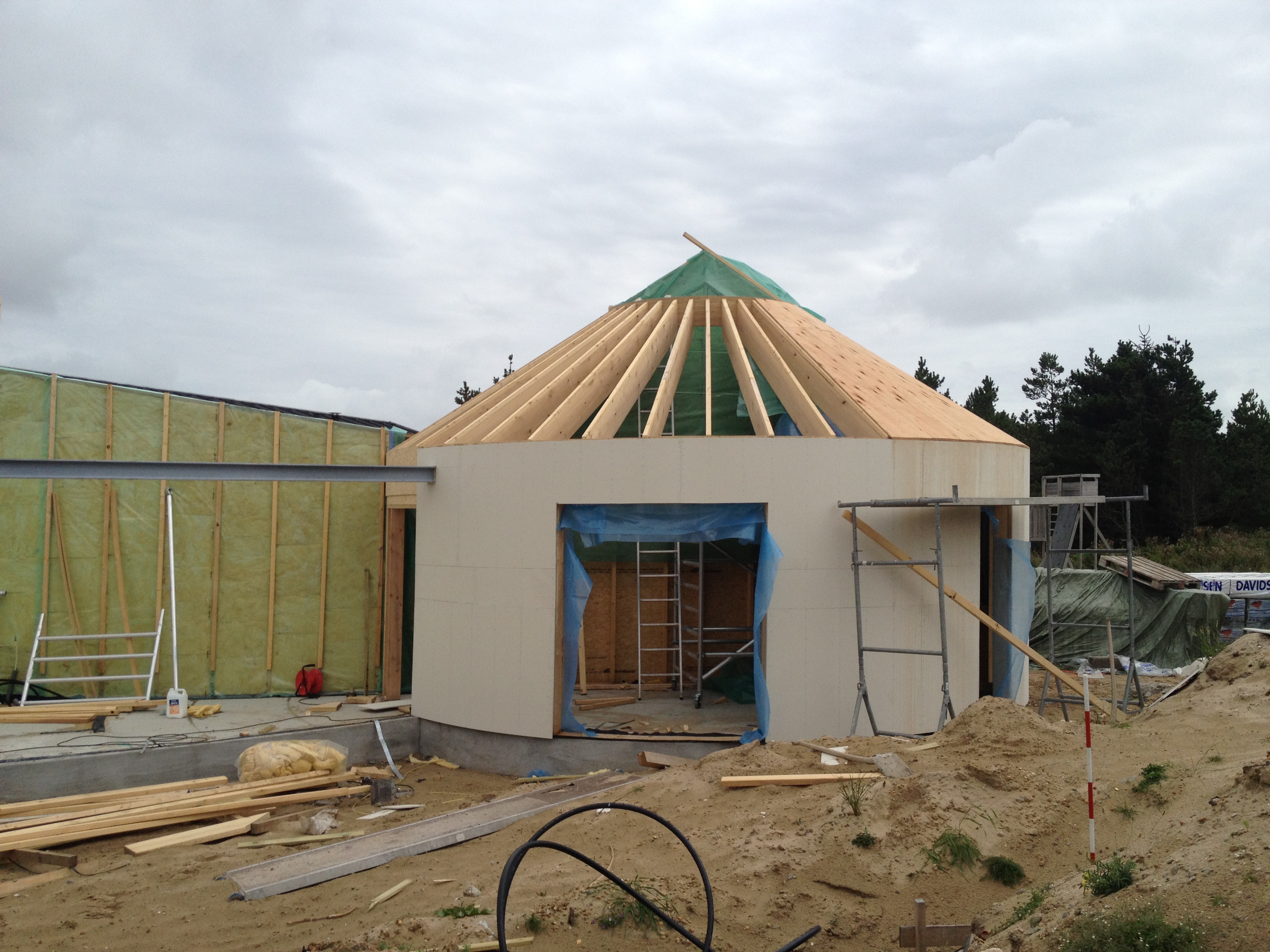 Udover galvaniseret stål er der brugt træ i massevis til at opføre vægge. Alle buede vægge er der lavet top og bundremme, som er skåret ud med stiksav i de givne radiusser. Der er nedslidt adskillige stiksave + klinger til denne opgave, da næsten alt runder og er meget specielt. Indvendige vægge er i Fermacell, udvendige vægge i STO Ventec plader. Der hvor radius er under ca. 3 meter er der brugt STO Ventec plader, både inde og ude, da disse kan bøjes nærmest uendeligt. Der er glasfibervæv på begge sider af pladen så den ikke knækker.
