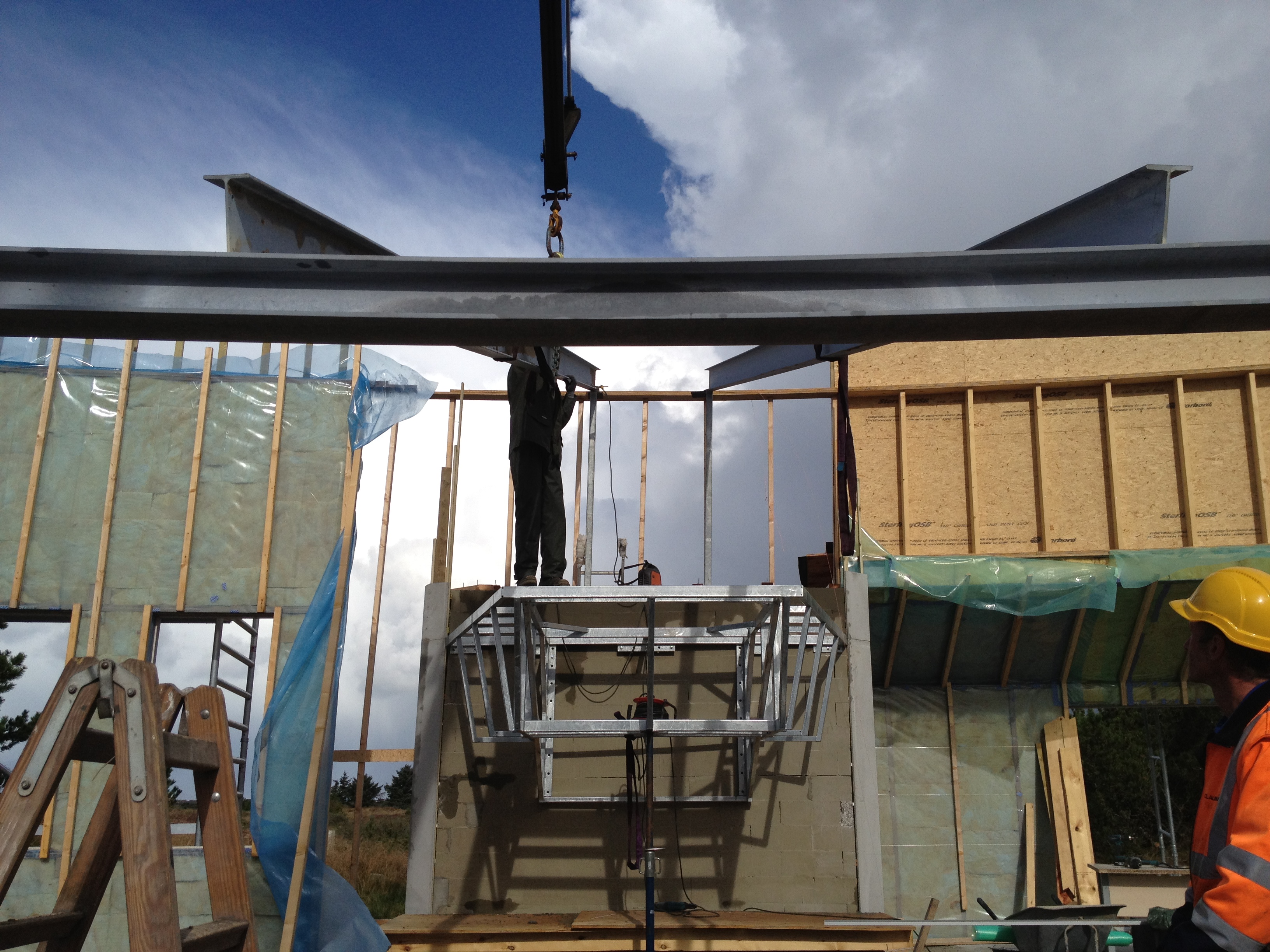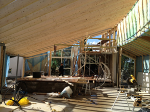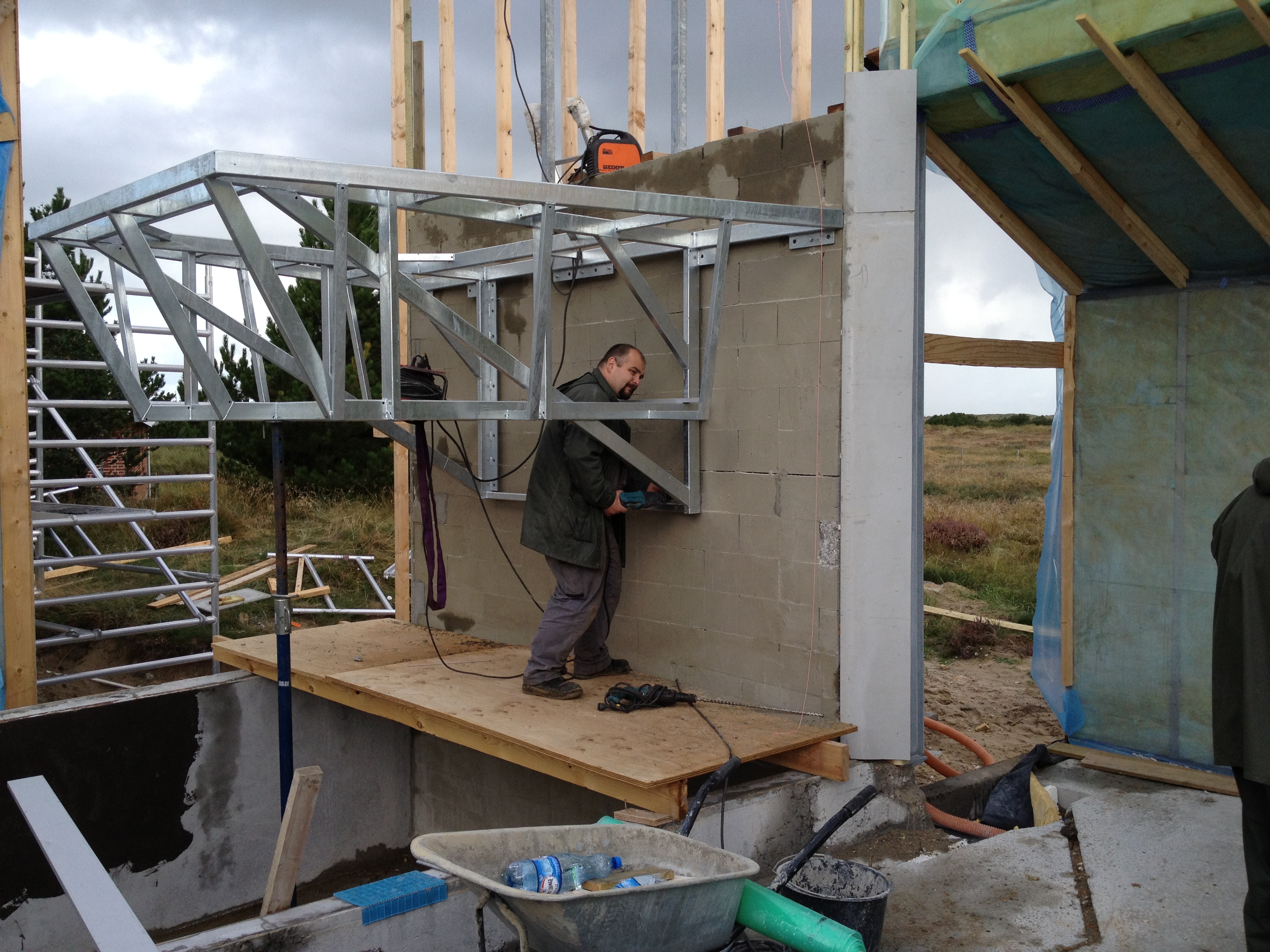 Konstruktionen er udført i jern skellet i valset galvaniseret stål. Som ses på nedenstående billeder. Der er derefter monteret fødder ind i det valsede stål på ydersiden for at låse konstruktionen. Derfor har det været muligt at få den store indvendige bue, som IKKE er direkte understøttet. Trykket fra taget går derimod ud mod buen, og ned i ydervæggen hvor der er placeret 2 kraftige stålben som støtter konstruktionen. Jern konstruktionen i huset er så avanceret at kun 1 virksomhed bød sig ind på opgaven, selvom 5 blev kontaktet.