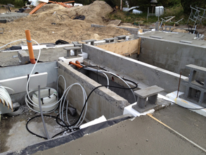 Spaplatformen er vel prikken over iet i huset. Bagvæggen som platformen hænger på er en 350 fundaments blok mur med i støbt aggressivt beton. Der er armeret på kryds og tværs med 14mm kamstål. Der er lavet en jernkonstruktion som er efterfølgende galvaniseret. Jernkonstruktionen er herefter boltet på væggen med 24 gennemgående 16mm bolte. I taget over hele poolområdet er der lagt 2 kraftige jernbjælker. På ende af spa platformen er der svejset 2 stk. massive stål rør ø25mm på, som så er svejset på de 2 store jernbjælker i taget. Hver stang vil kunne klare et træk på ca. 15 ton. De 2 stålrør er næsten ikke til at få øje på fordi der er gelænder rundt omkring dem. Med de 2 stænger er afgørende for at spaplatformen bliver hvor den er. Jernkonstruktionen har ingen forbindelse til det øvrige tag, så evt. snetryk vil ikke påvirke spaplatformens placering.