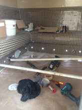 Dampbad er ligeledes udført i ren glasmosaik med sædevarme, bruser, lys i sæder, stjernehimmel, musik og aromaduft system. Sæderne i dampkabiner er koniske og buede så de passer med husets centrum. Det giver en flot effekt i glasmosaikken i damdadet fordi de er buede. Såderne er lavet i en kreativ blanding af gasbeton og 200mm kloakrør. Der er centralvarme sædevarme i sæderne og ryglænet, for at de skal være varme at sidde på. Det er en vigtig detalje da et dampbad med kolde sæder er ubrugelig. Fugerne i glasmosaiken er selvlysende Epoxyfuge. Og det hele er oplyst med 12 spots i sæderne + 250 stk. stjerner i loftet der funkler.